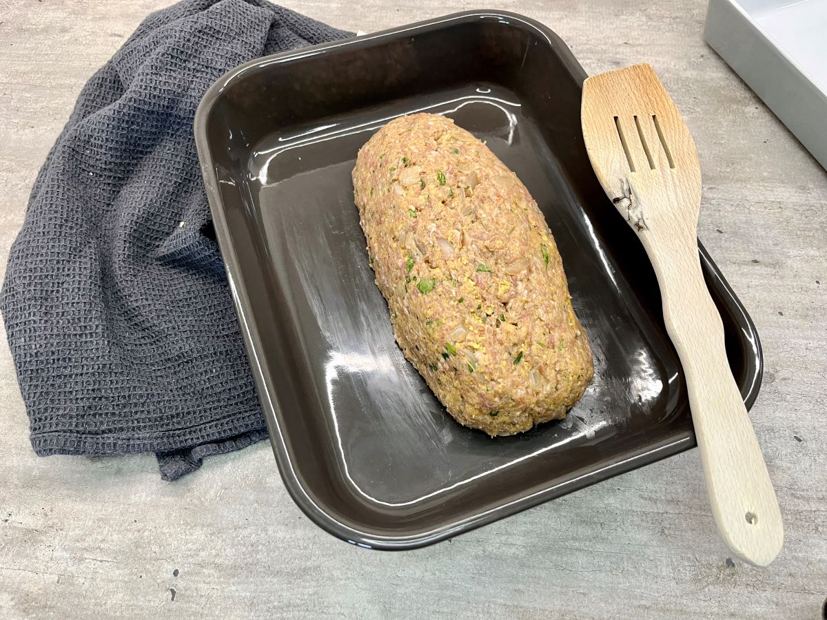 2. Fašírku v pekáči mierne podlejeme vodou a vložíme piecť do vyhriatej rúry pri 180 °C asi 50–60 minút dozlatista. V druhej polovici pečenia ju polievame vzniknutým výpekom. Hotovú fašírku môžeme podávať so zemiakovou kašou a kyslou uhorkou alebo napríklad s čerstvým chlebom.