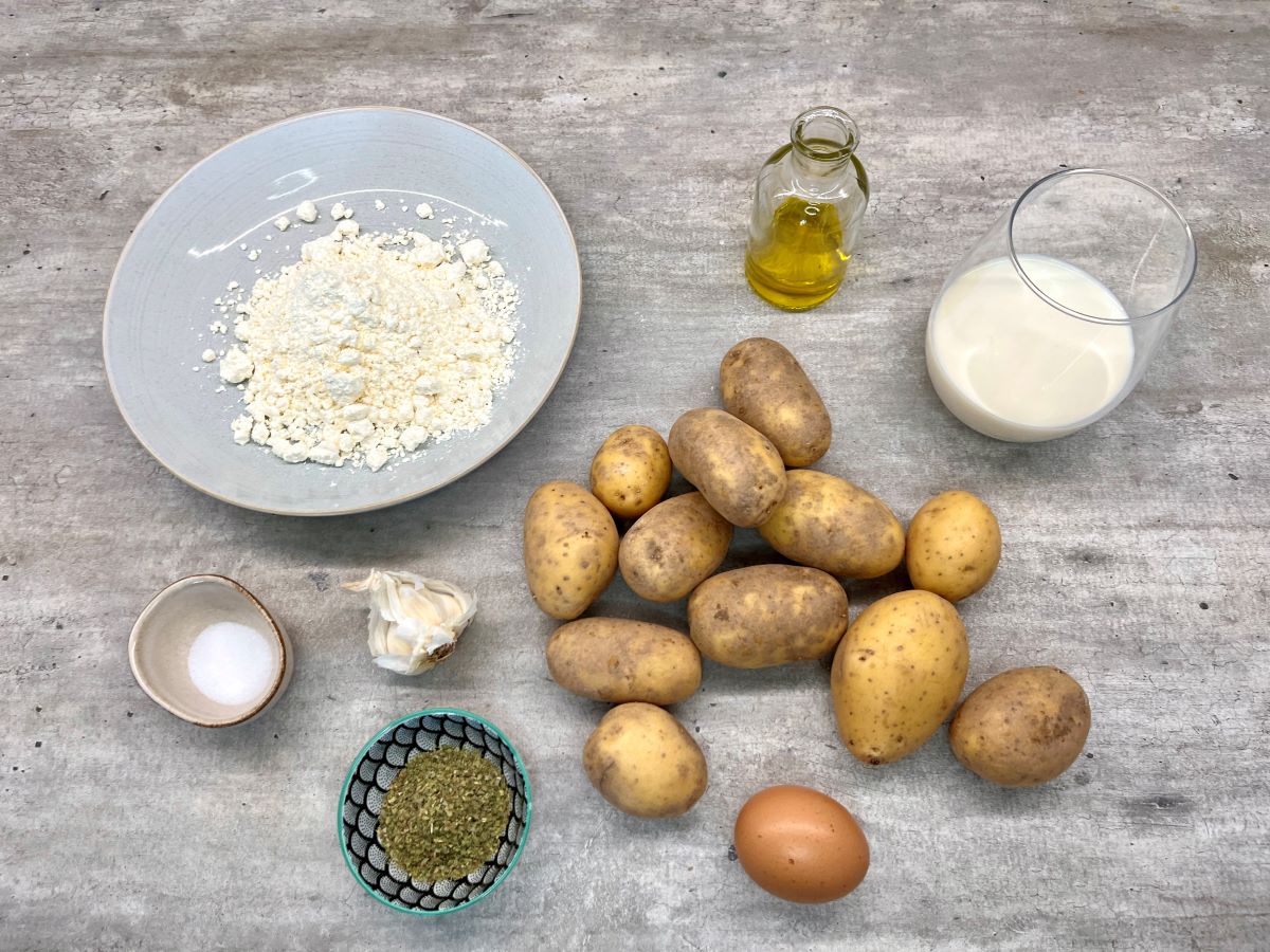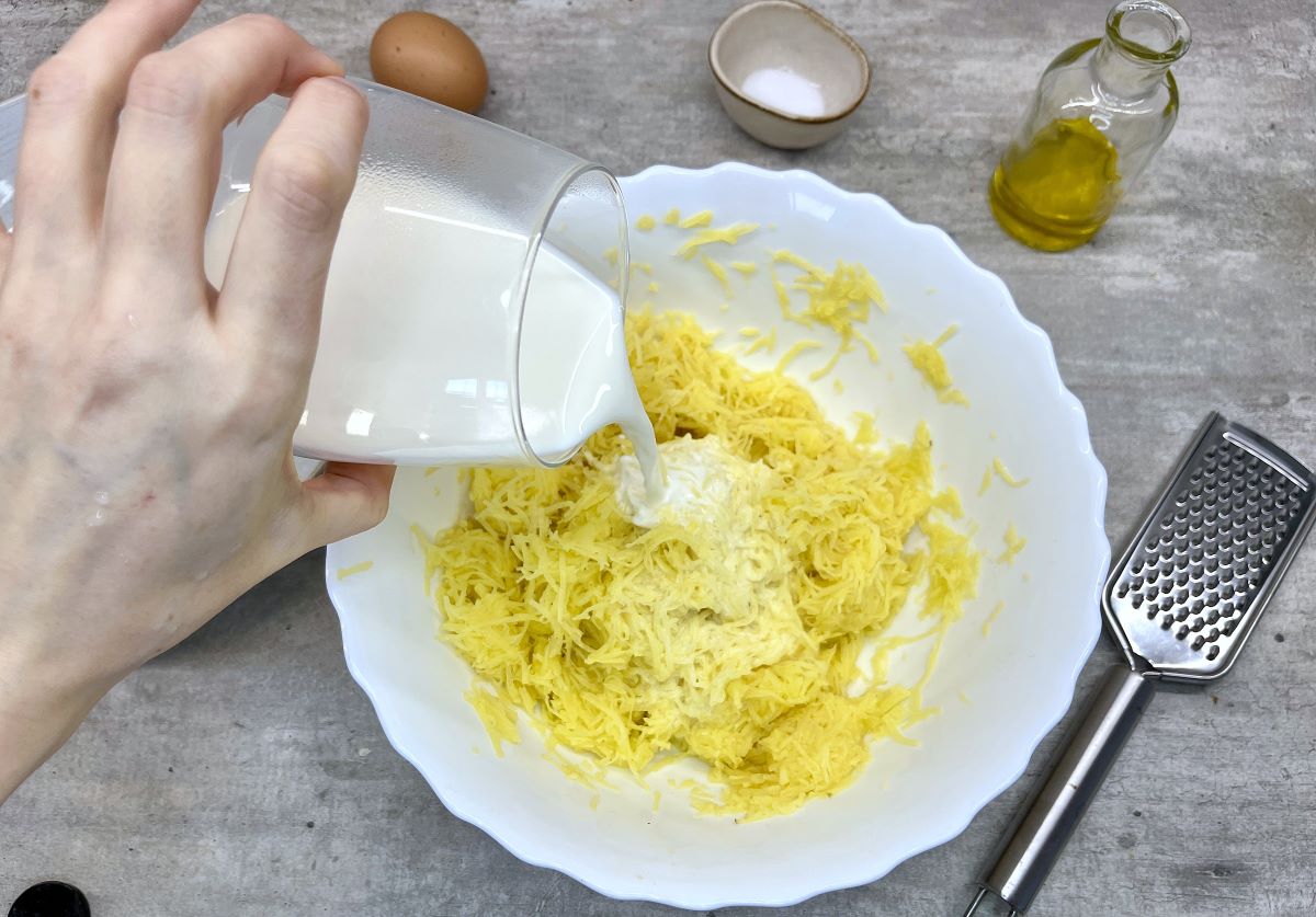1. Zemiaky ošúpeme a nastrúhame na jemnom strúhadle do misy. Necháme chvíľu odstáť a vytlačíme prebytočnú vodu, ktorú zlejeme. Prilejeme horúce mlieko a prisypeme Jizerku. Dochutíme nastrúhaným cesnakom, majoránkou, ktorú rozmrvíme medzi prstami, a soľou. Cesto dôkladne premiešame. Mali by sme získať mierne tekutejšie zemiakové cestíčko.