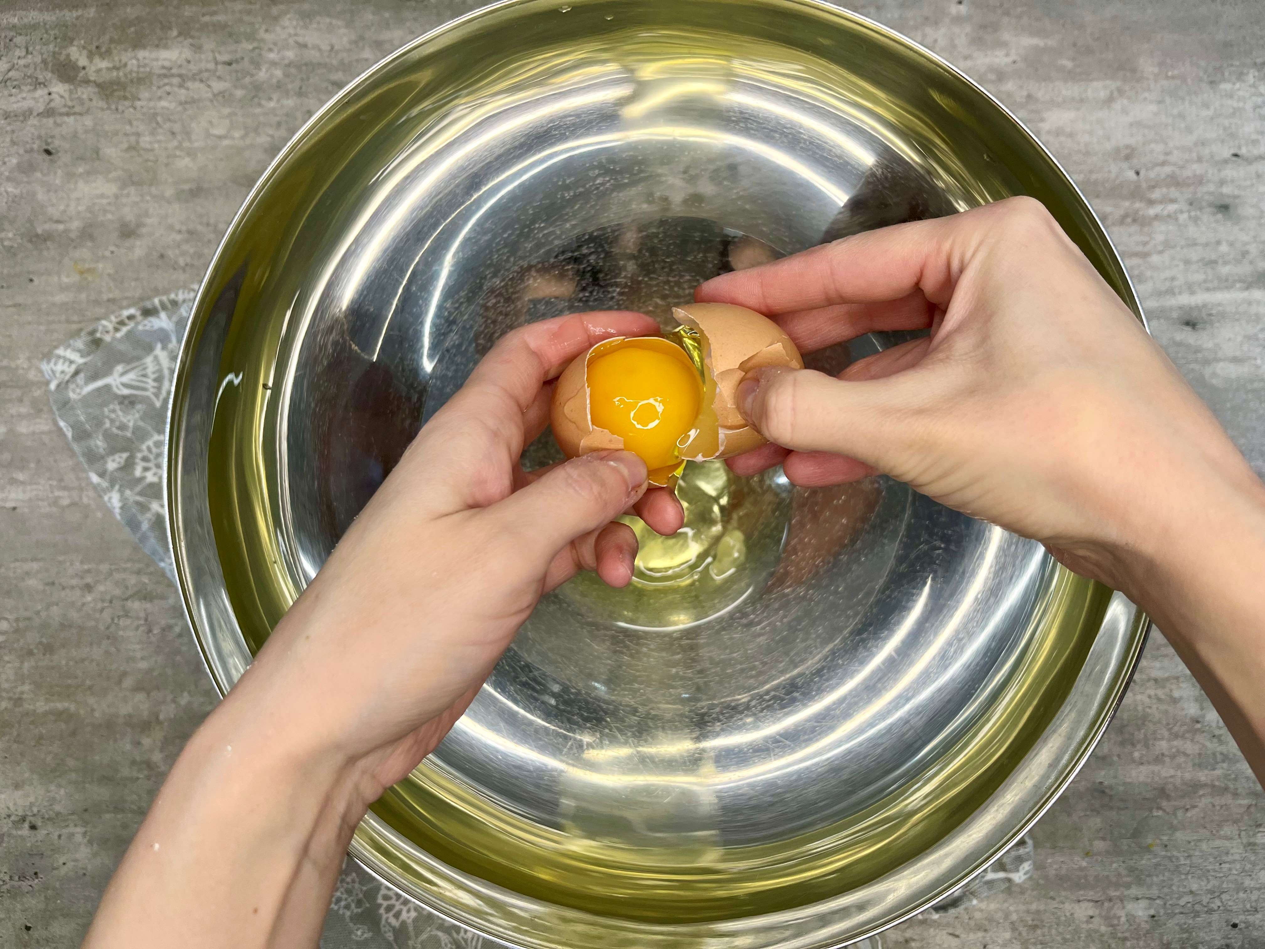 1) Najskôr oddelíme bielky od žĺtkov. Bielky vyšľaháme so štipkou soli do tuhého snehu. Žĺtky vyšľaháme do peny a postupne po štyroch dávkach zašľahávame horúcu vodu a olej.