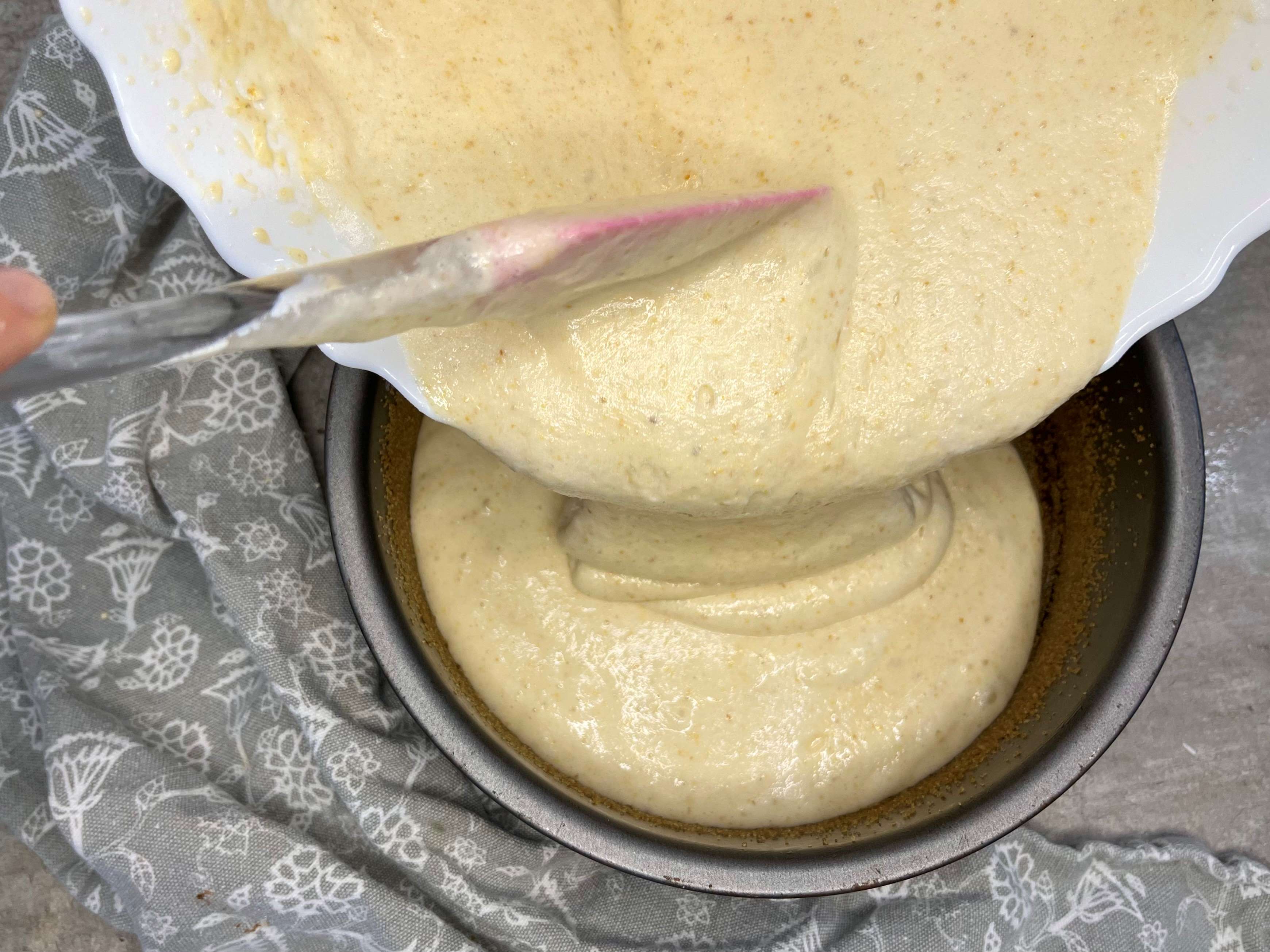 2) K žĺtkovej zmesi postupne prisypávame preosiatu múku zmiešanú s kypriacim práškom a stále miešame. Nakoniec jemne primiešame vyšľahaný sneh. Cesto nalejeme do olejom vymastenej a cukrom vysypanej formy. Pečieme v predhriatej rúre pri 170 °C približne 30 minút.
