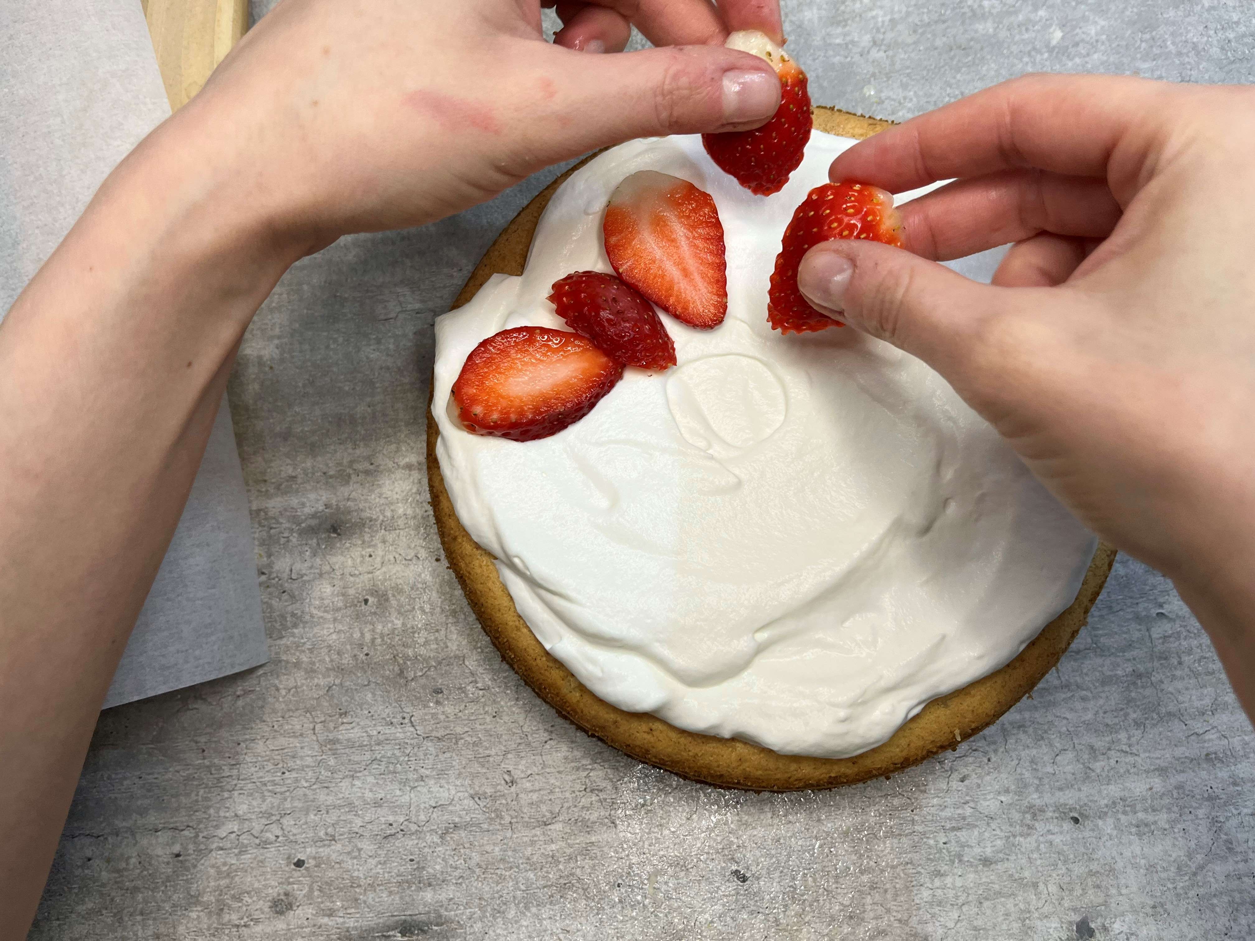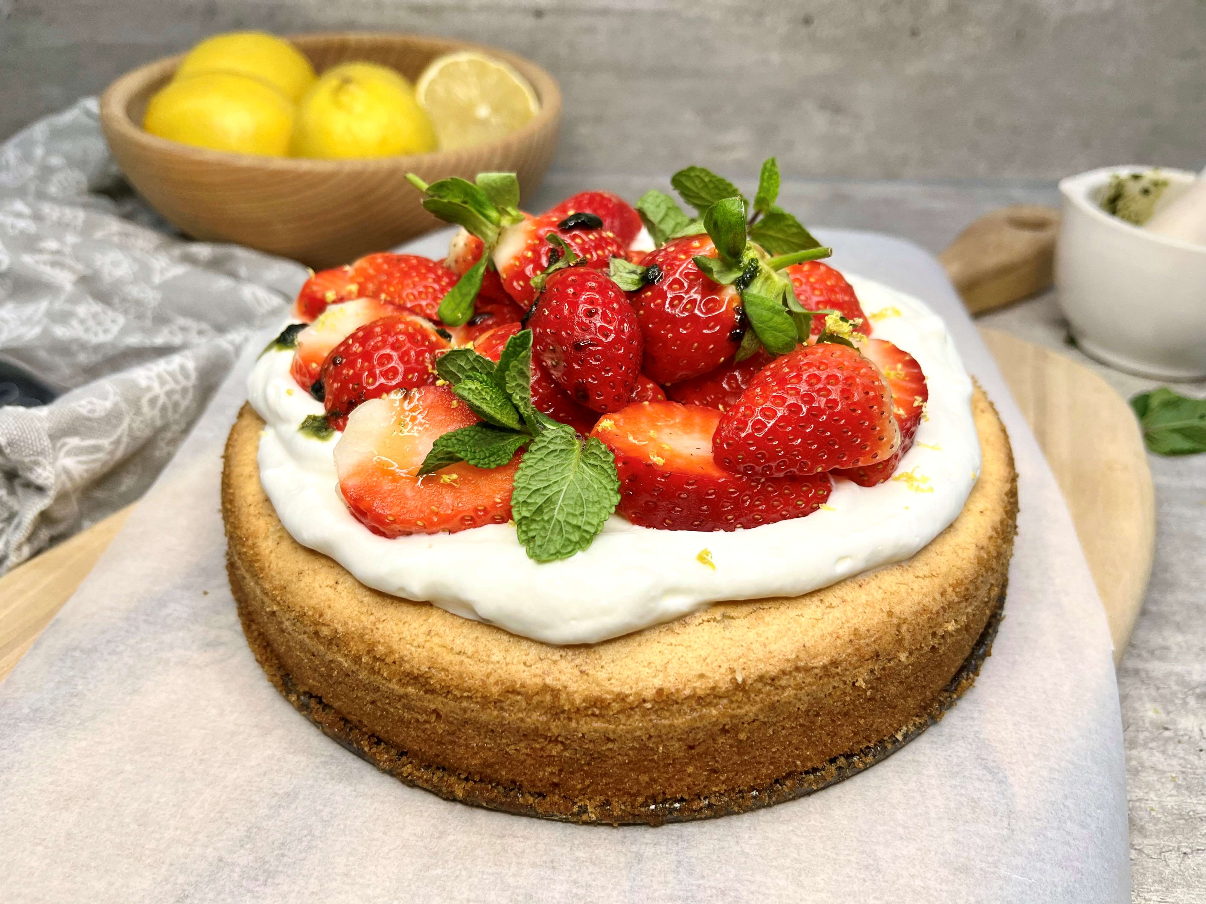 3) Smotanu s cukrom vyšľaháme dotuha a rozotrieme ju na vychladený korpus. Ozdobíme kúskami jahôd, mätou, citrónovou kôrou a mätovým pestom, ktoré si pripravíme z lístkov mäty, cukru a trochy vody – najlepšie rozdrvením v mažiariku na hladkú pastu.