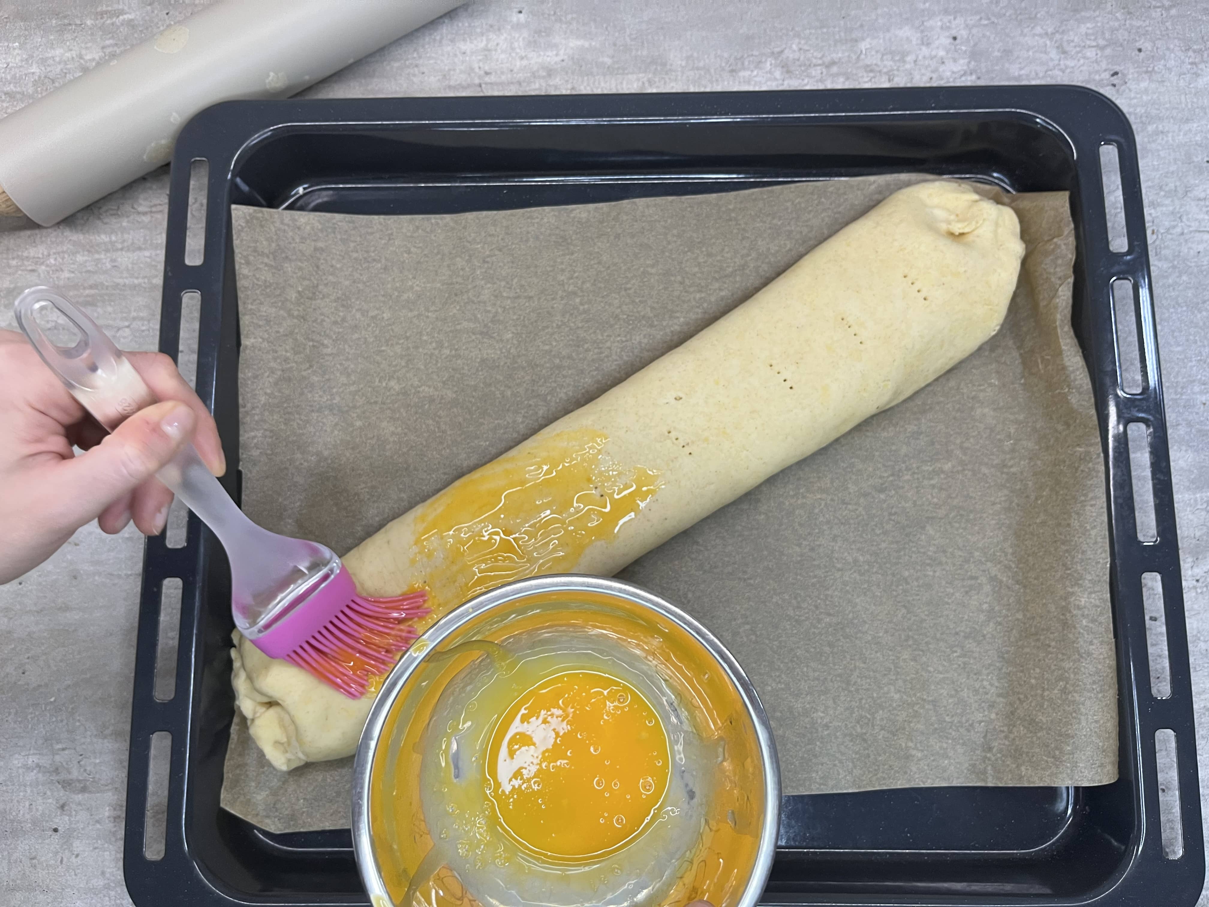 - Štrúdľ opatrne zarolujeme, na viacerých miestach popicháme vidličkou, aby mohla unikať para, a potrieme rozšľahaným žĺtkom. Pečieme v teplovzdušnej rúre pri 170 °C asi 20 minút. Po upečení necháme vychladnúť a posypeme práškovým cukrom.