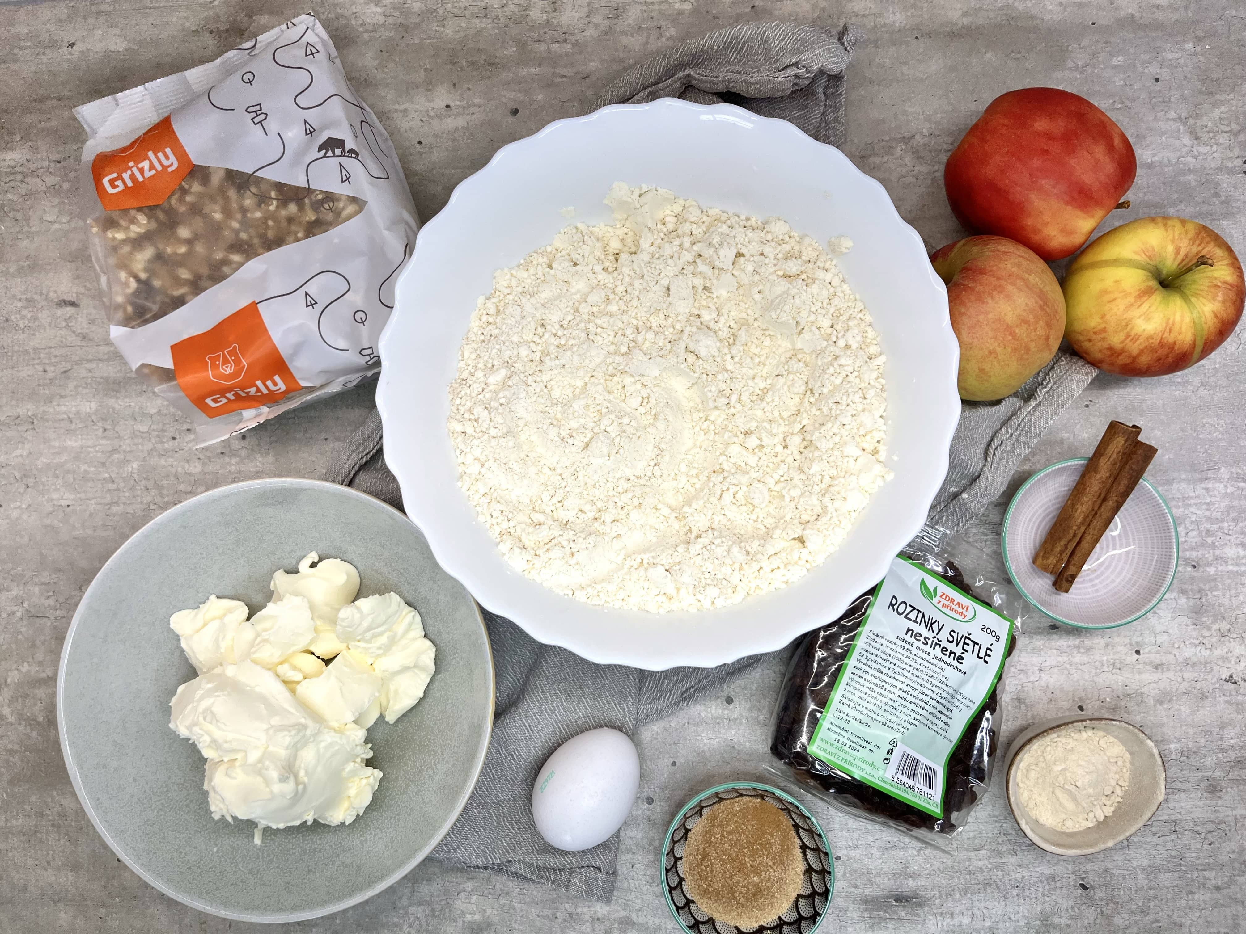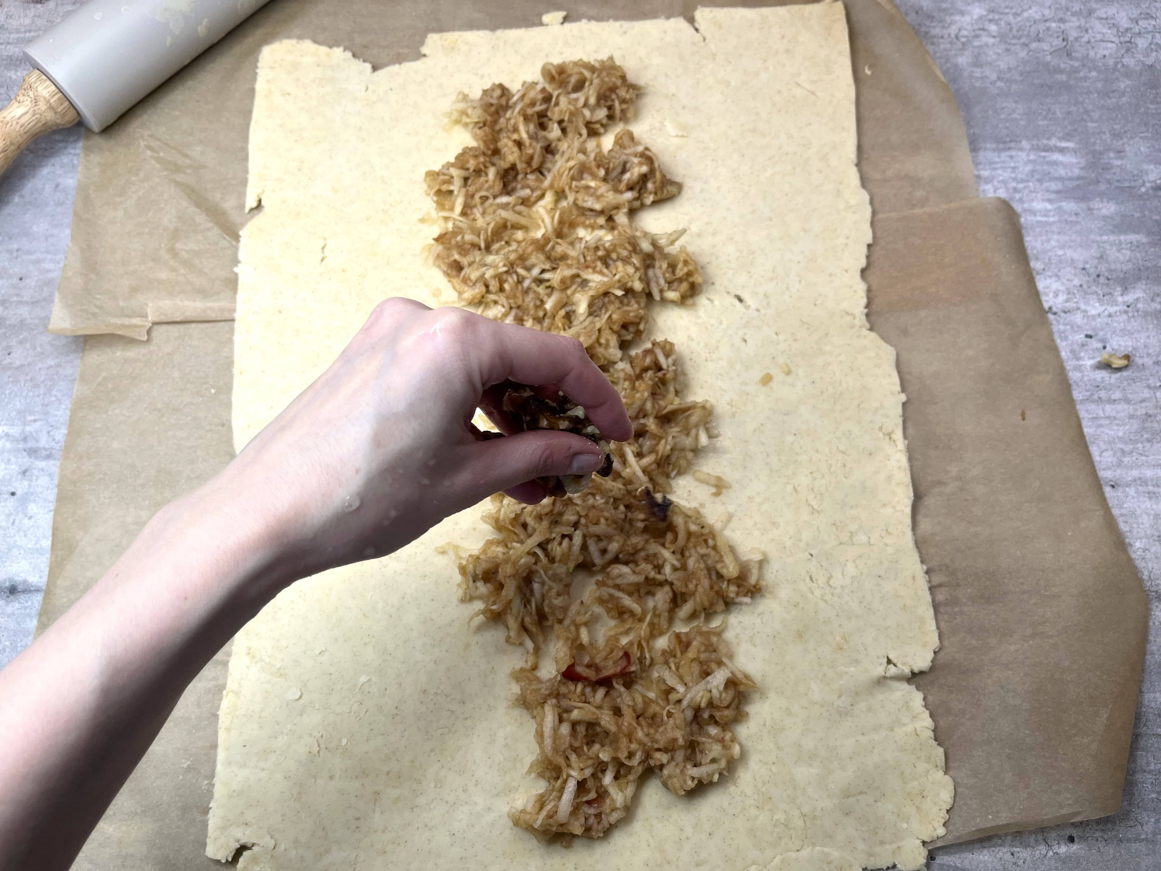 - Odležané cesto rozvaľkáme na pomúčenej doske alebo na papieri na pečenie na čo najtenší plát (prípadne na dva menšie). Jabĺčka zbavíme prebytočnej šťavy, rozložíme ich na cesto a posypeme hrozienkami a nasekanými orechmi.