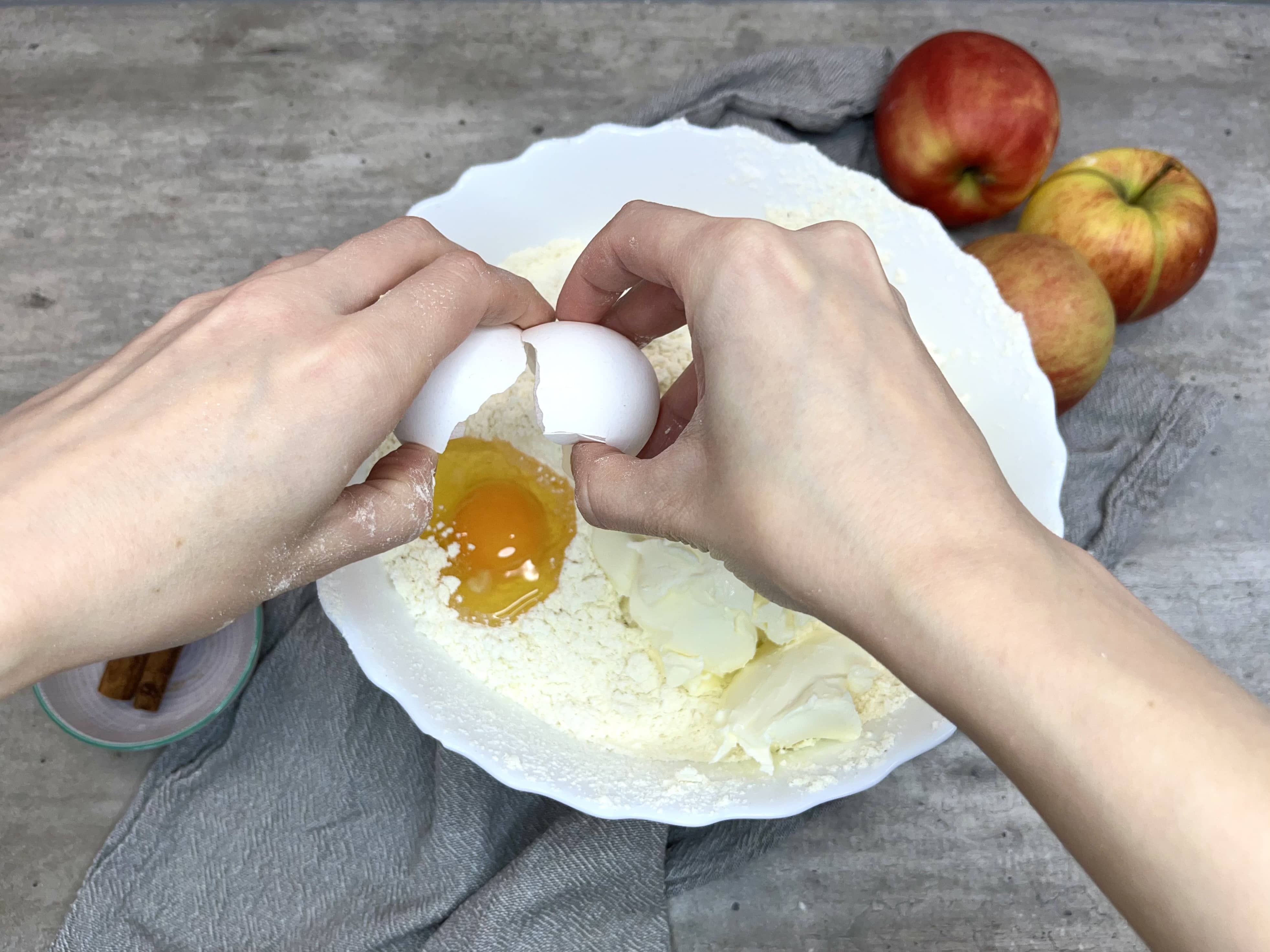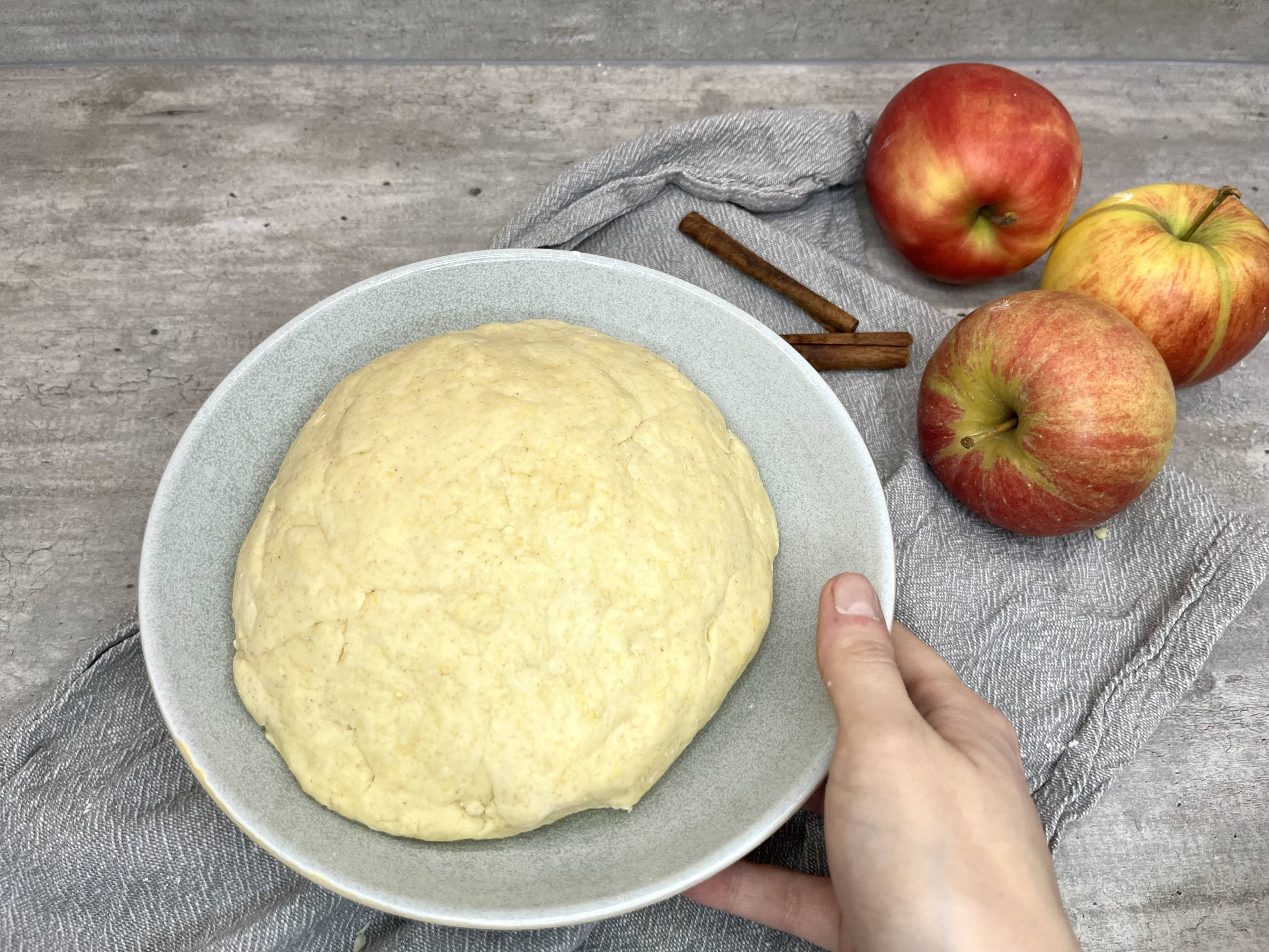 - Medzitým si pripravíme plnku. Jabĺčka ošúpeme, nastrúhame alebo nakrájame na kúsky a pridáme škoricový cukor a citrónovú šťavu.