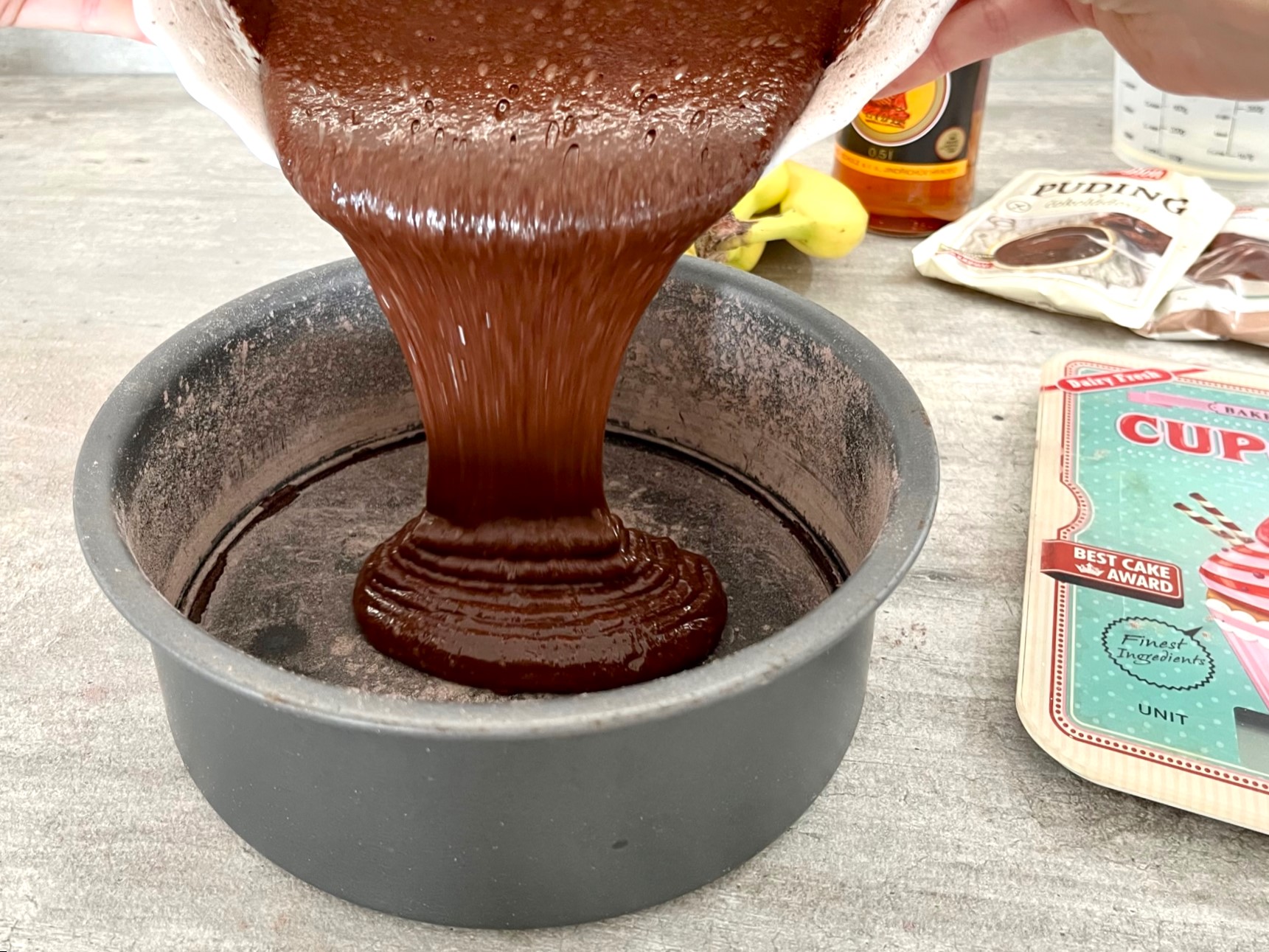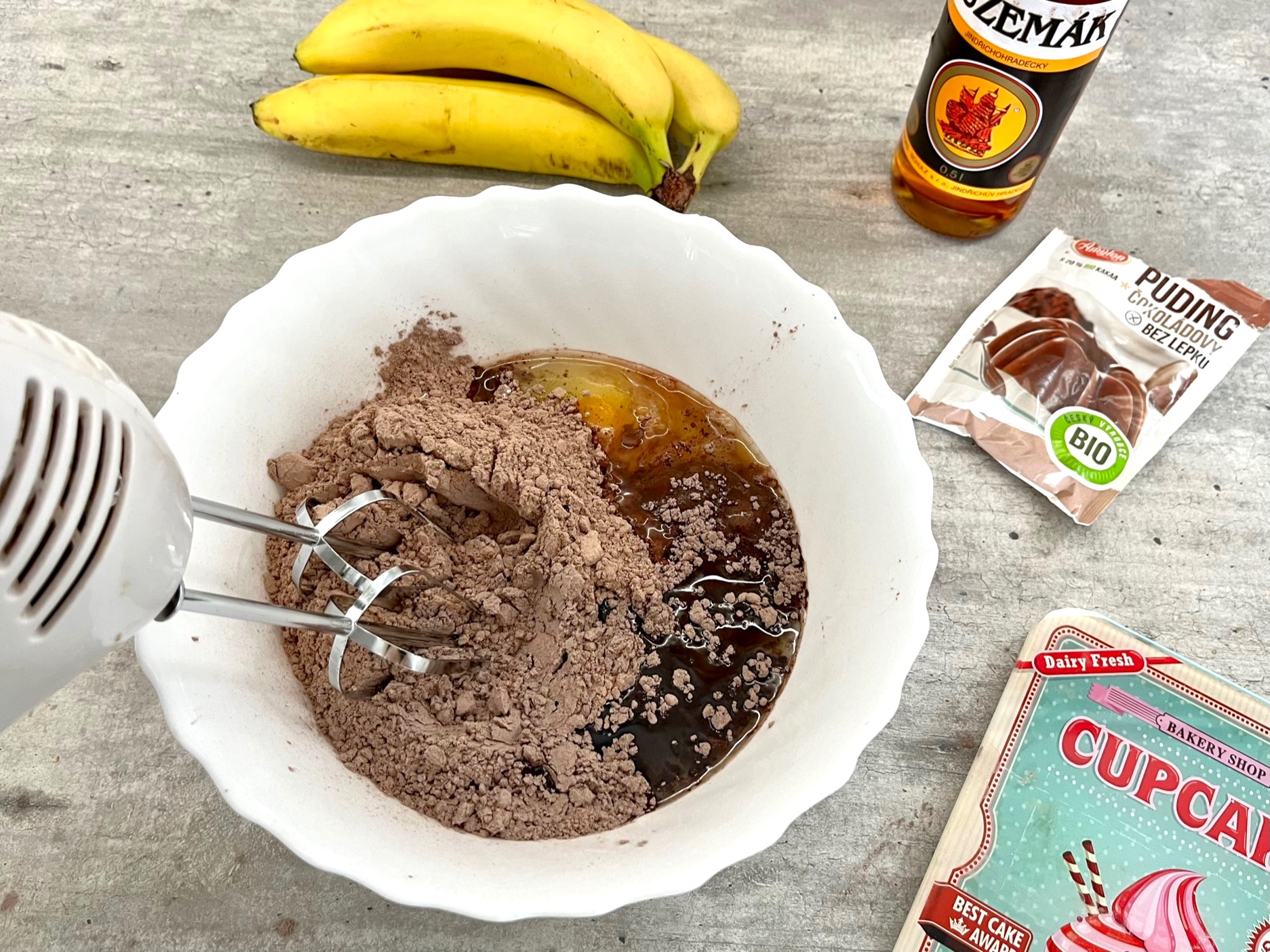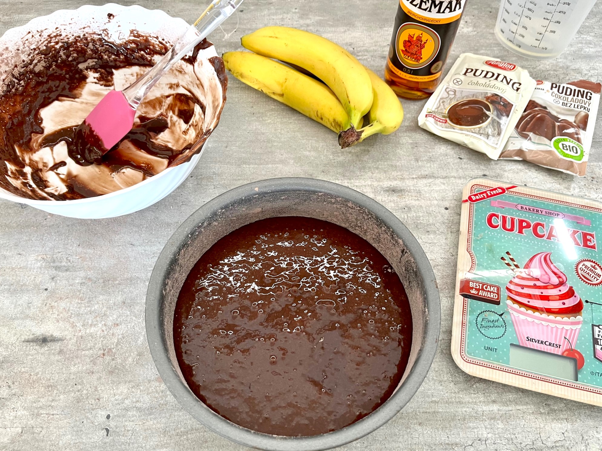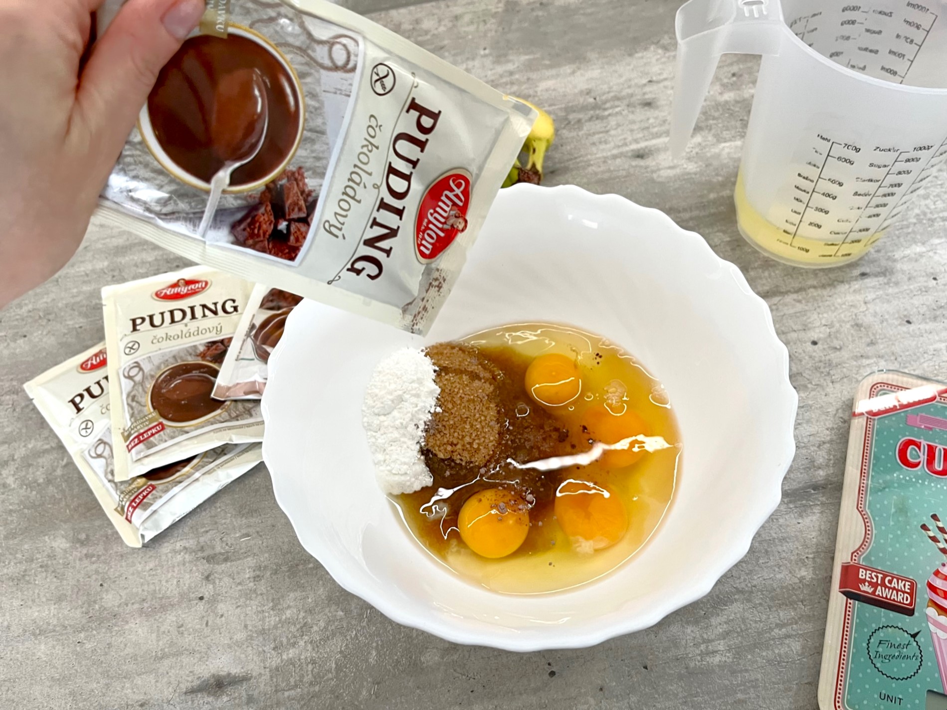 1) Formu na tortu vymastíme olejom a vysypeme trochou čokoládového pudingu (prášku).