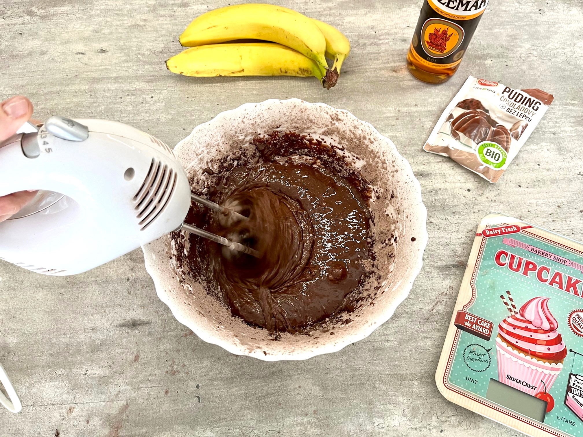 2) Všetky suroviny na korpus vyšľaháme dohromady a nalejeme do vymastenej formy. Pečieme približne 30–40 minút v teplovzdušnej rúre pri 150 °C.