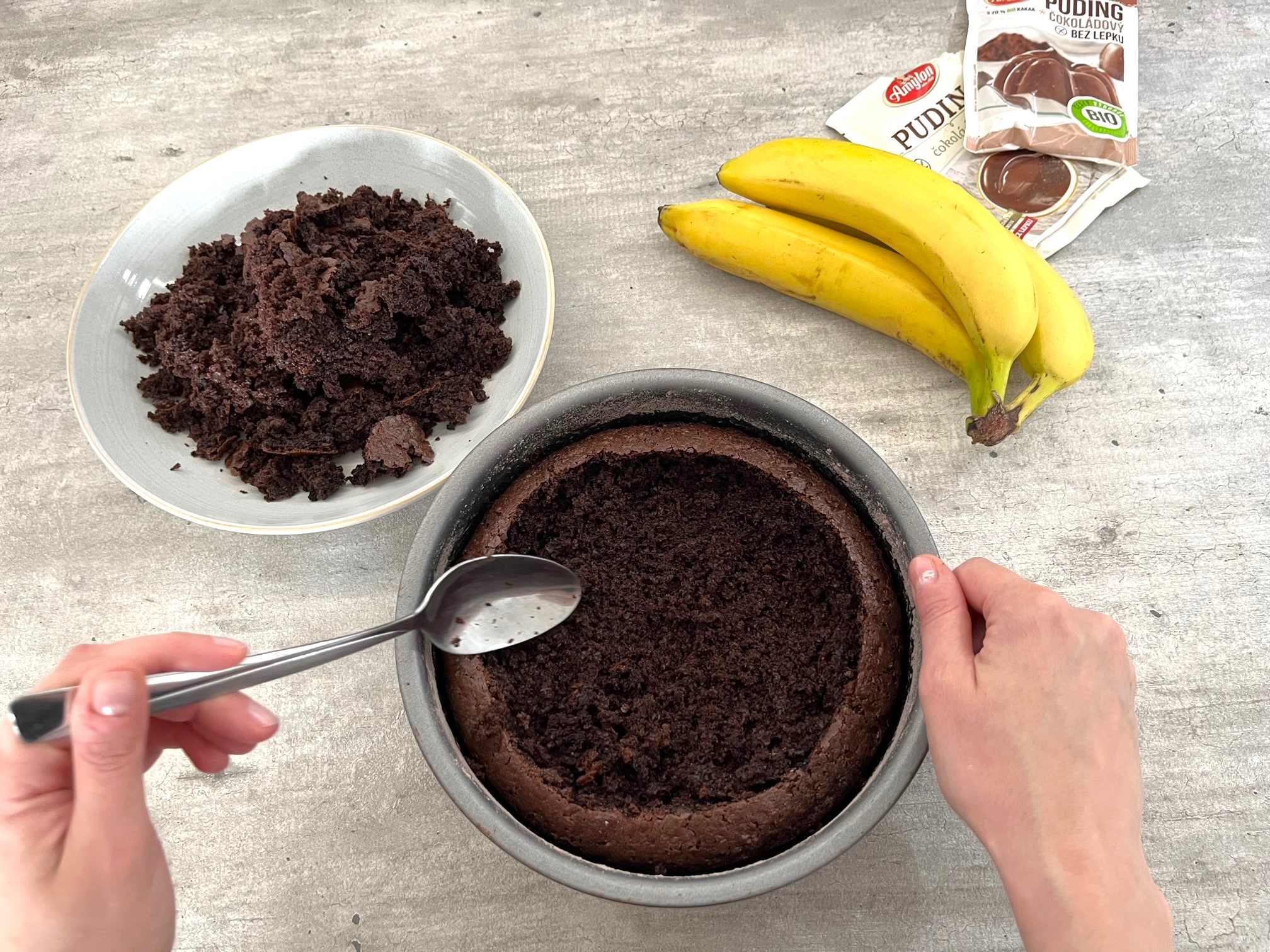 3) Hotový korpus necháme vychladnúť. Po vychladnutí opatrne vydlabeme stred, aby po okrajoch zostala vrstva cesta hrubá asi 1,5 cm. Rozdrobené cesto odložíme bokom.