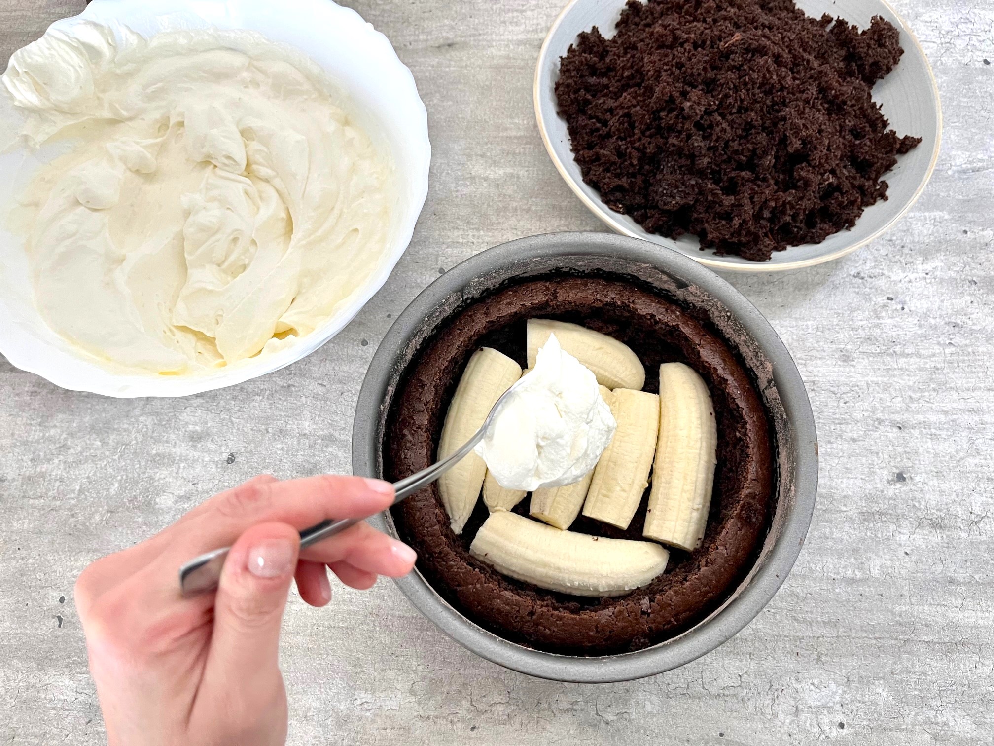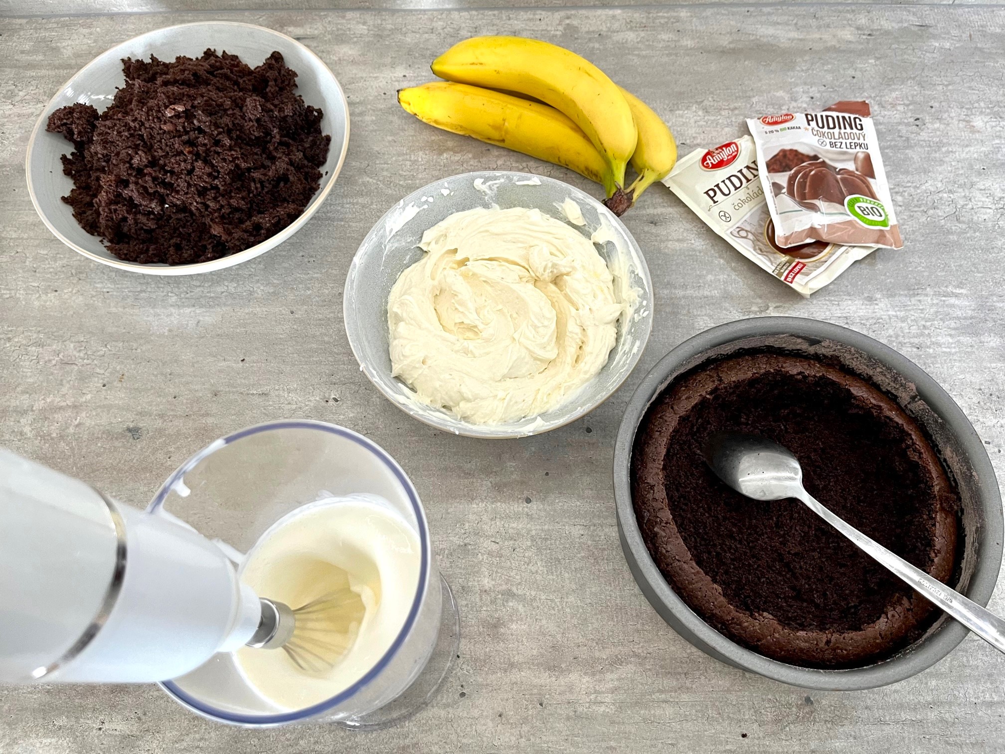 5) Vyšľaháme smotanu dotuha, tvaroh osladíme a spolu s maslom vyšľaháme do hladkého krému. Krém vrstvíme na banány.