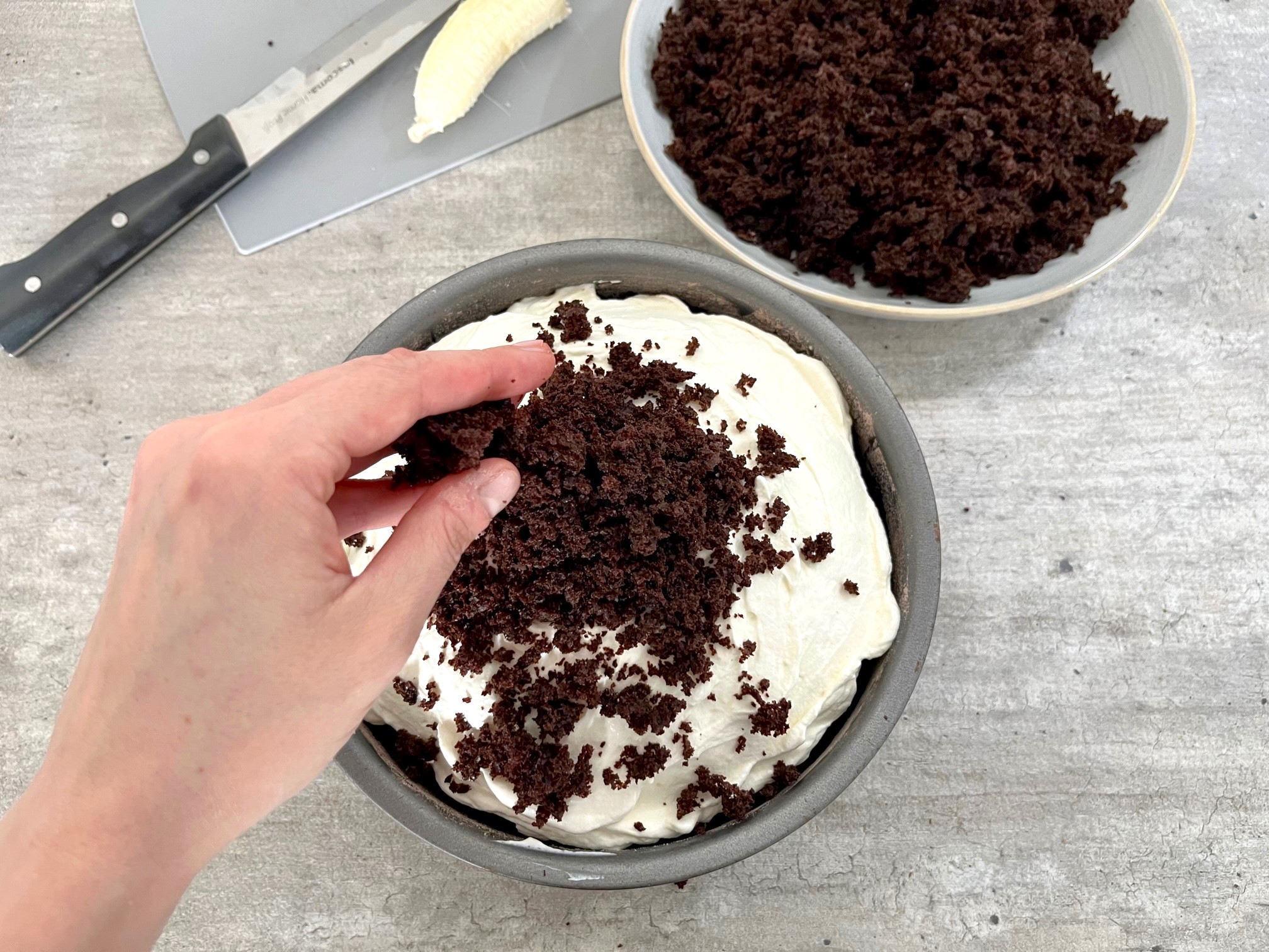 6) Rozdrobené cesto nasypeme na vrstvu krému a jemne pritlačíme. Hotovú tortu necháme chladiť v chladničke aspoň dve hodiny.