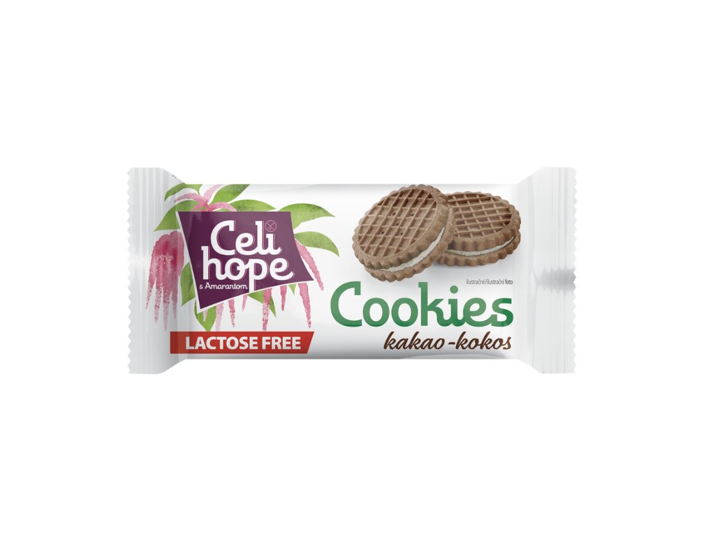 Kakaové sušienky Celihope Cookie kakao-kokos sú vyrobené z kvalitných bezlepkových ingrediencií vrátane kukuričnej a amarantovej múky. Obsahujú 25% kokosovú krémovú náplň, ktorá dodáva sušienkam výnimočnú chuť a vláčnosť. Sušienky sú obohatené o kyselinu listolovú, ktorá prispieva k normálnej funkcii imunitného systému.