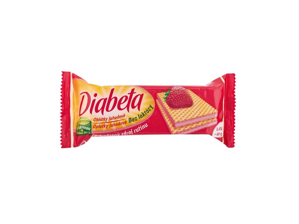 Jahodová oplatka Dibeta je bezlaktózová oplatka s krémovou jahodovou náplní (73%) a kyselinou listovou. Je vhodná k rychlému doplnění energie pro športovcov, pri fyzickej alebo psychickej záťaži.