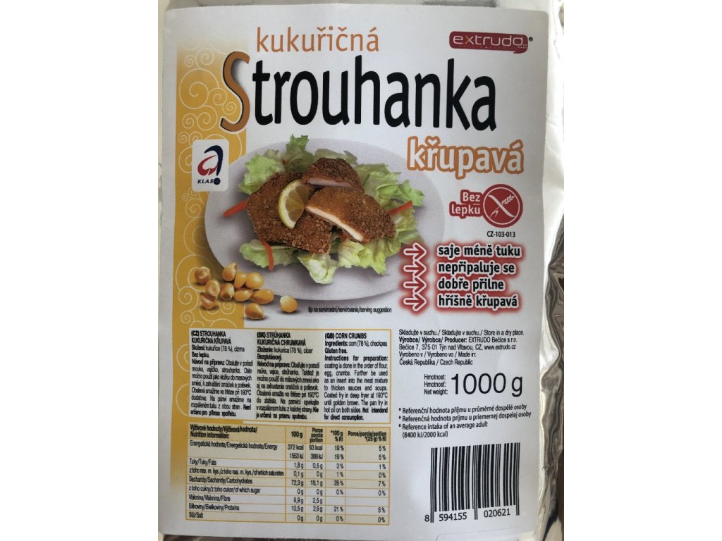 Kukuričná strúhanka chrumkavá je príjemne chrumkavá a prirodzene bezlepková. Je určená na obalovanie a vyprážanie, zahušťovanie, varenie i pečenie namiesto klasickej strúhanky. Strúhanka kukuričná chrumkavá spĺňa trendy moderného stravovania. Príjemne chrumká a v porovnaní s klasickou strúhankou nesaje toľko tuku. Je vhodná na obalovanie mäsa, zeleniny, húb alebo syrov. Extrudovaný výrobok.