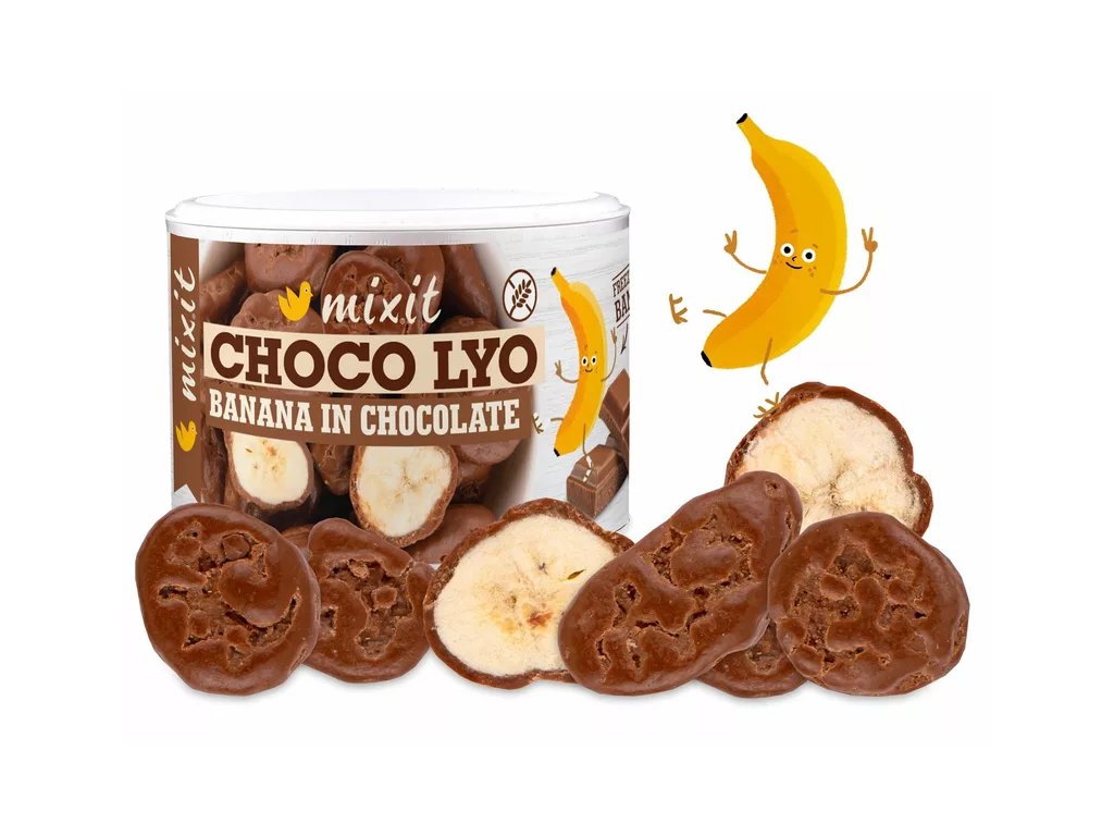 Banán v mliečnej čokoláde (mliečna čokoláda 82 % (cukor, kakaové maslo, sušené mlieko, kakaová hmota, emulgátor: lecitíny; prírodná vanilková aróma), lyofilizovaný banán 17 %, leštiaca látka: arabská guma; sacharóza, med; v mliečnej čokoláde obsah kakaovej sušiny najmenej 30 %)