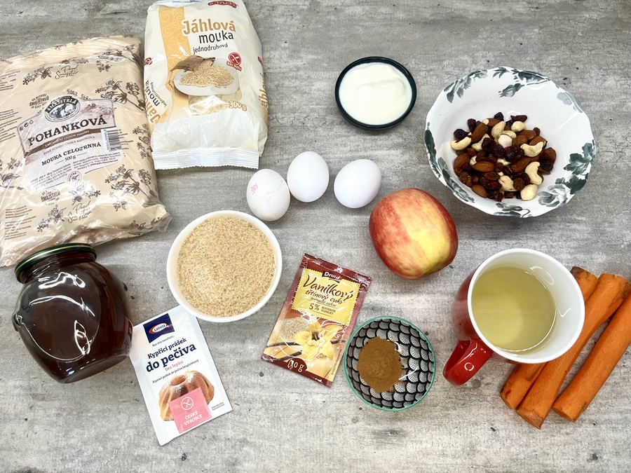- 2 hrnčeky bezlepkovej múky (pšeno, pohánka, ryža, možno kombinovať)