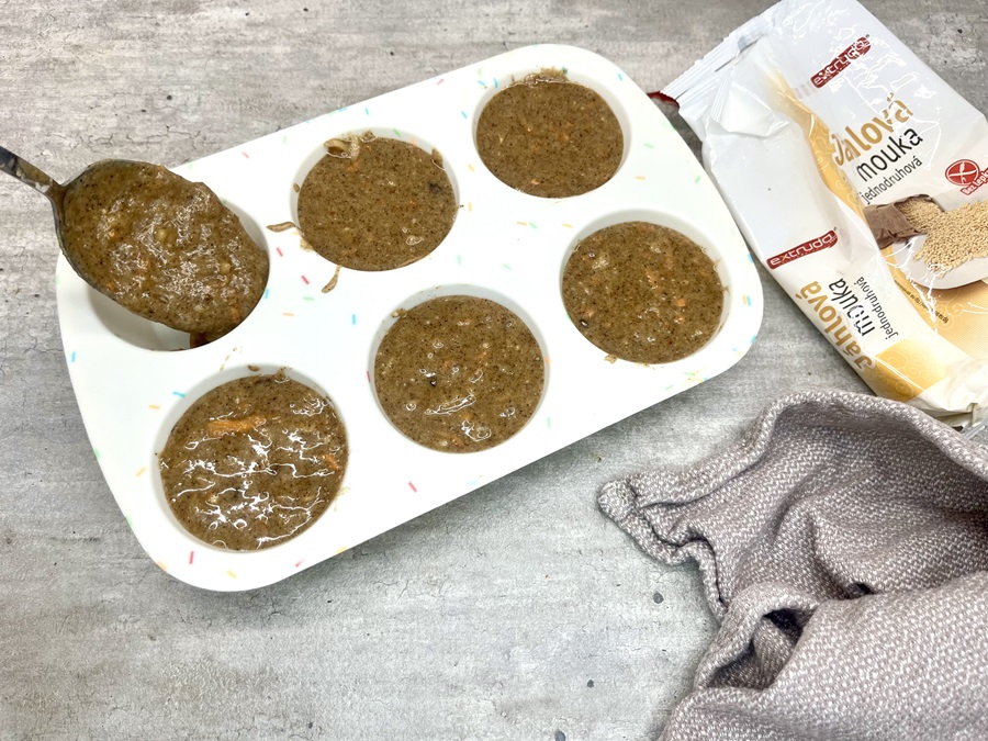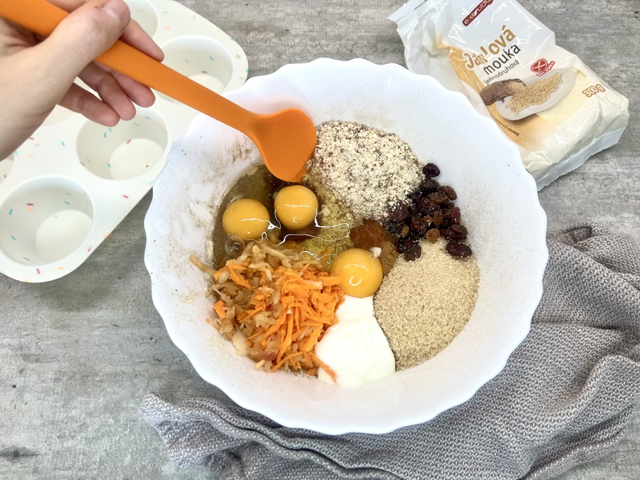 1. Mrkvu a jablko nastrúhame najemno. Prenesieme do misy a zlejeme prebytočnú šťavu. Pridáme všetky ostatné suroviny a dôkladne premiešame. Cesto postupne nalejeme do maslom vymastenej a múkou vysypanej formy na muffiny.