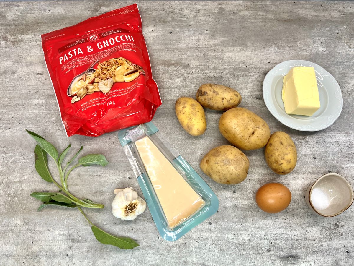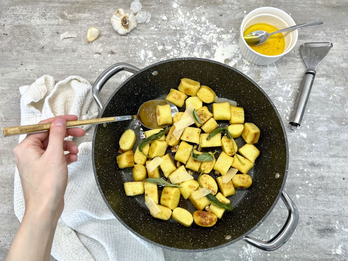 4. Ak použijete ghí, ktoré už neobsahuje vodu ani bielkoviny, tento krok môžete vynechať. Ku koncu varenia pridáme do masla strúčiky cesnaku a lístky šalvie. Krátko opečieme, vyberieme a maslo odložíme bokom. Prípadne kastrólik zospodu zľahka ochladíme, aby sa maslo nepripálilo. Hotové noky opečieme na panvici dozlatista. Podávame preliate orieškovým maslom, posypané lístkami šalvie, parmezánom a vlašskými orechmi.