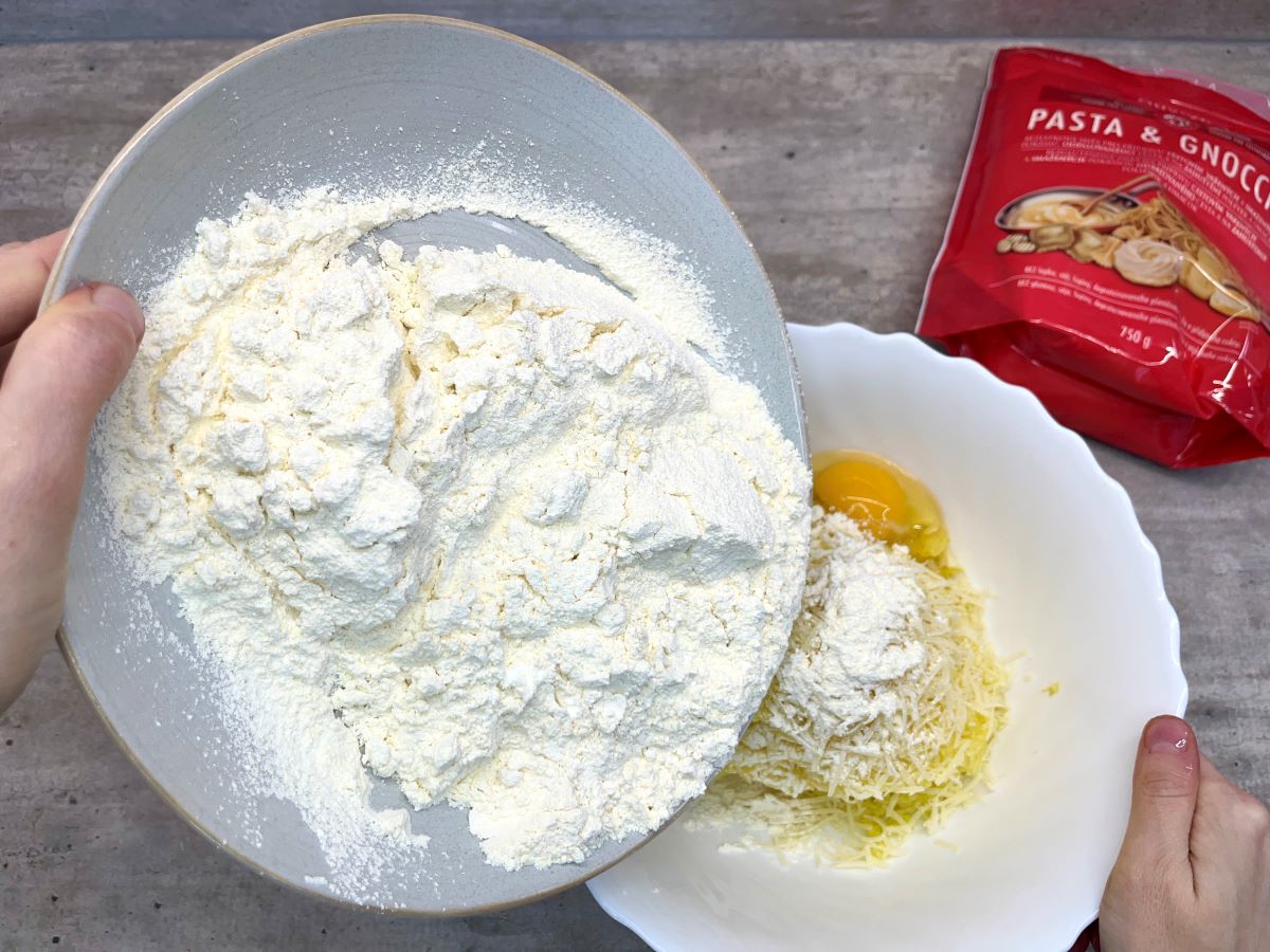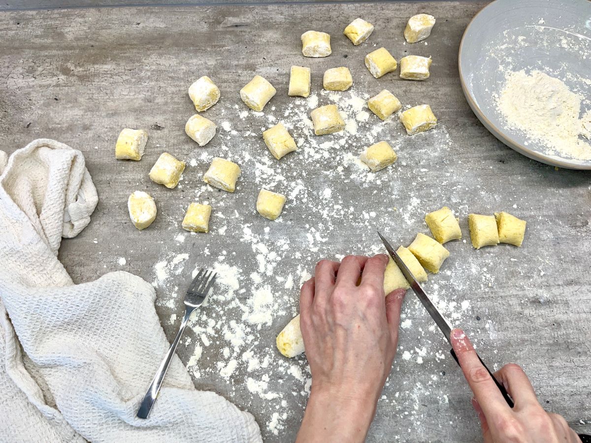 2. Z hotového cesta vždy odtrhneme kúsok a na posypanej ploche vyvaľkáme dlaňami tenký valček. Nožom ho nakrájame na malé rovnomerné kúsky – noky, ktoré tiež jemne poprášime zmesou. Noky môžeme nechať takto alebo im pomocou vidličky vytvoriť typický ryhovaný vzor. Varíme ich vo vriacej osolenej vode, kým nevyplávajú na povrch. Potom ich scedíme a odložíme bokom.